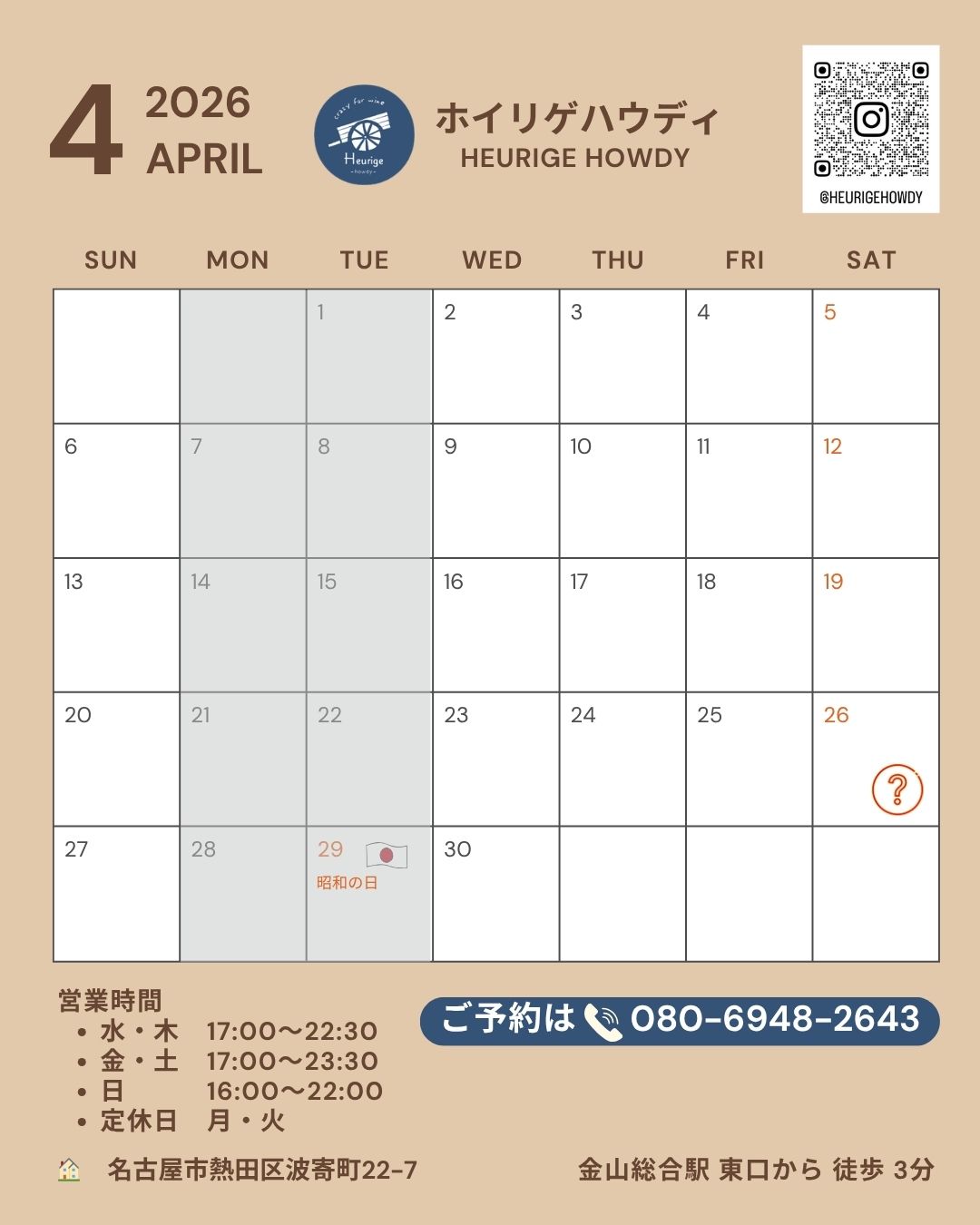 2026年4月の営業カレンダー